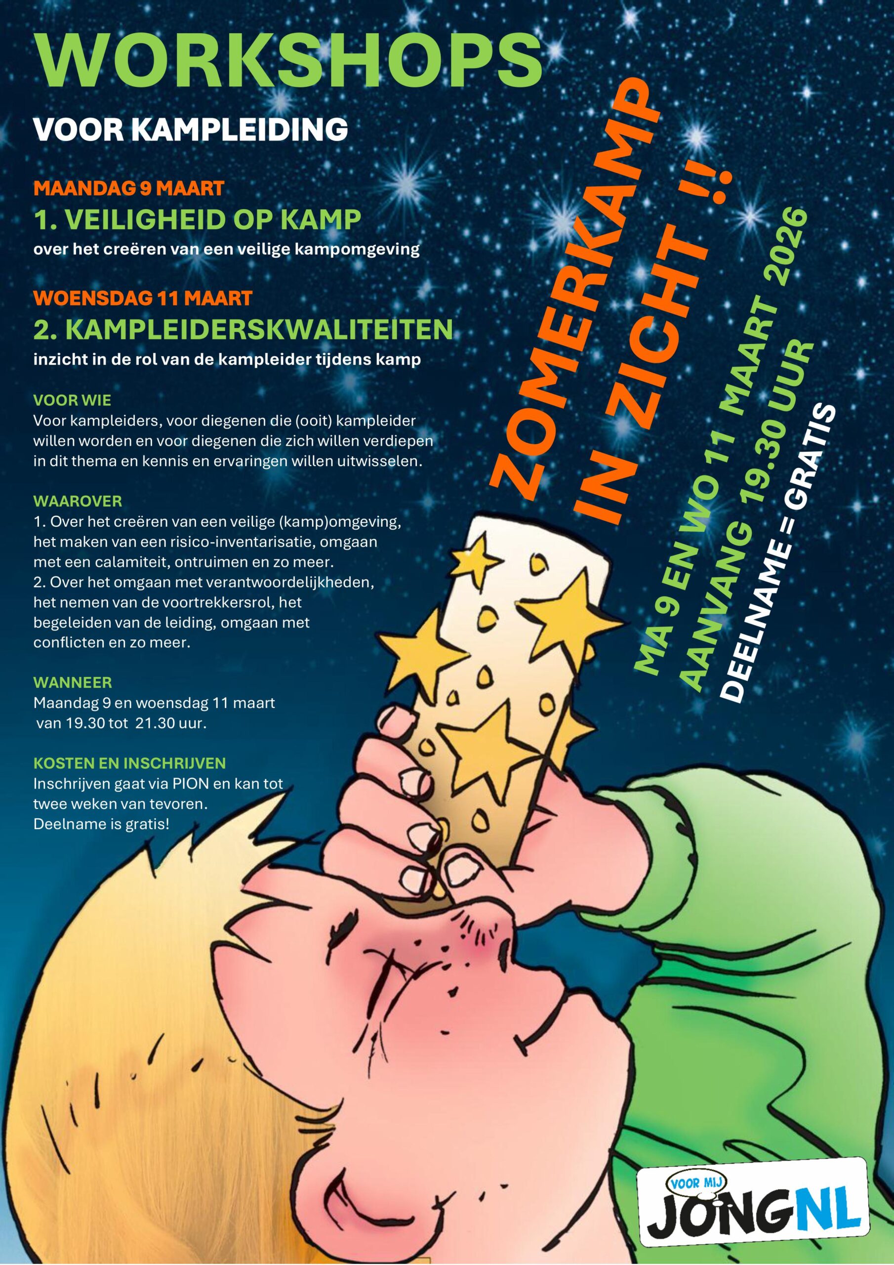 Voor kampleiders, potentiële kampleiders en voor iedereen die zich verder wil verdiepen aan de aspecten van het op kamp gaan zijn worden, tijdens de jaarlijkse workshopweek, een drietal workshops aangeboden die inzicht geven in de rol van de kampleider tijdens een JongNL zomerkamp: