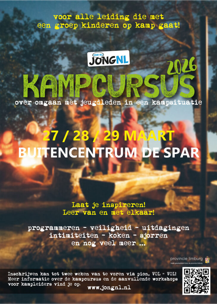 Tijdens de kampcursus bekwamen vrijwilligers zich in taken en verantwoordelijkheden als leider/vrijwilliger op kamp. JongNL Limburg wil leiding/vrijwilligers de kans wil bieden zich te bekwamen in een diversiteit aan facetten rondom het kamp. De kampcursus is een belangrijk hulpmiddel voor een vrijwilliger om zich te verdiepen in de aspecten van het kamperen en zich te bekwamen in vaardigheden die onlosmakelijk verbonden zijn met het ‘op kamp gaan’ met een groep kinderen. Leiding is niet alleen bezig met de activiteiten, maar ook met het eten op kamp, hygiëne, slapen en omgaan met elkaar. Er is veel tijd te vullen, dat vergt een specifieke manier van programmeren. Daarbij zijn kinderen dag en nacht in elkaars nabijheid, dat kan voor spanningen zorgen. Het is belangrijk te weten hoe je met al die situaties omgaat.