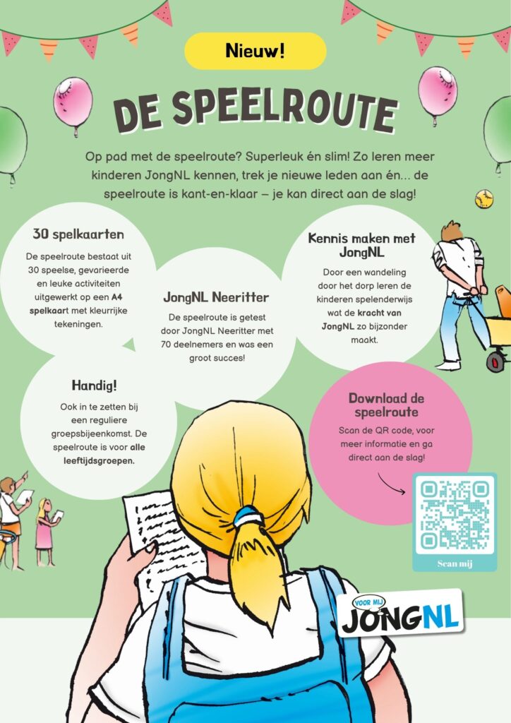 Met de Speelroute ontdekken kinderen op een speelse manier wat JongNL te bieden heeft. Tijdens een wandeling door de wijk of het dorp doen de kinderen allerlei toffe spellen die passen bij de JongNL-methodiek. Perfect als actie om JongNL meer bekendheid te geven en nieuwe leden te werven! Het mooie? Alles is al kant-en-klaar uitgewerkt én helemaal gratis!