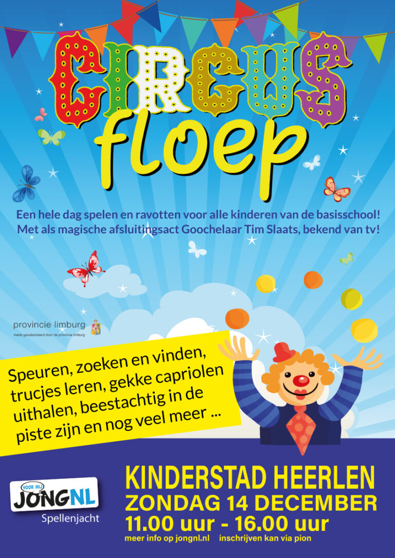 Circus Floep is tijdens de Spellenjacht daar te gast. Deze dag kunnen kinderen een hele dag spelen en speuren naar de artiesten van Circus Floep. Deze artiesten leren de kinderen de kneepjes van het circus-vak. Trucjes doen bij de goochelaar, klimmen en klauteren met de acrobaat, deelnemen aan de beestachtige show in de piste en nog veel meer. Zoek, speur en vind de circusartiesten en ga de uitdaging aan. Aan het einde van de dag sluiten we af met een magische act van Goochelaar Tim Slaats, die je kunt kennen van TV, met jullie als JongNL’ers in de hoofdrol!
